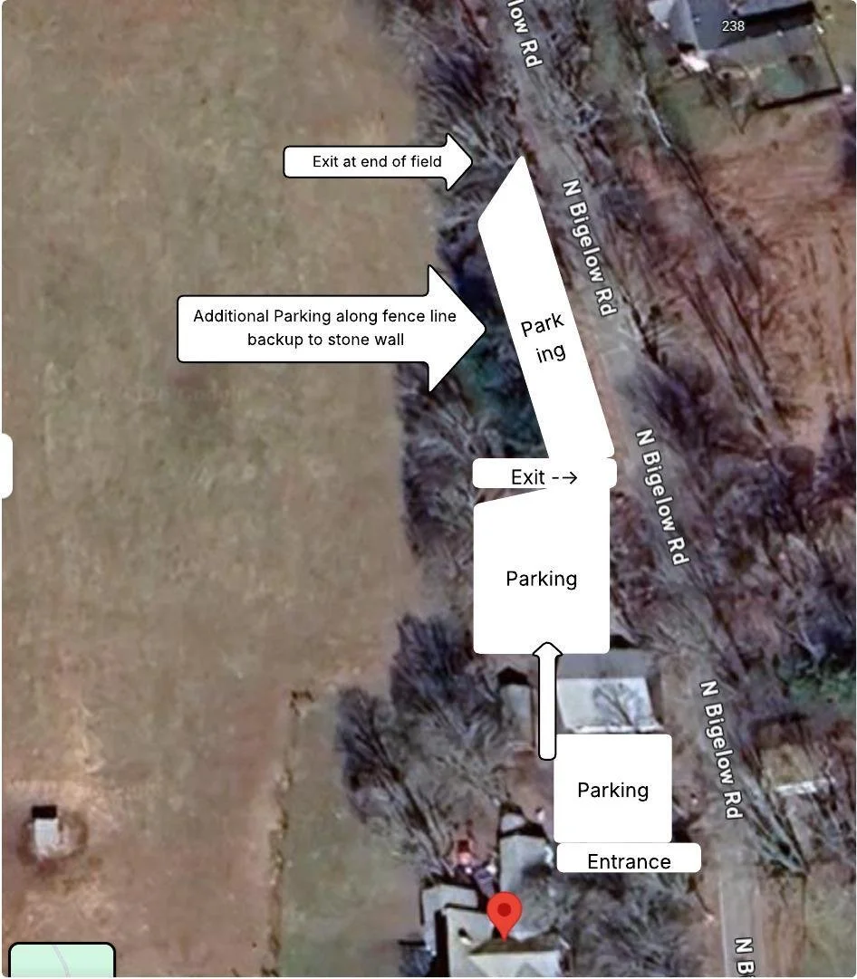 Q: Where do i park? Look at the map provided, we have plenty of parking along the stonewall and behind the garage on the right when you pull in. We can accommodate about 25-30 cars at a time.